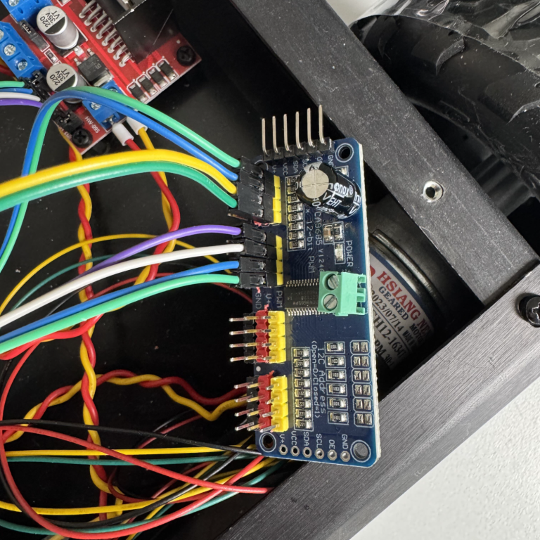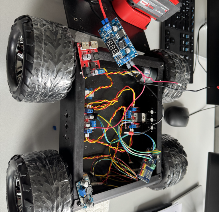 verbaut wurden ein LM2596S DC DC Step Down Modul zur Spannungsregelung, ein weiterer DC DC Step Down Converter, ein AZL298N Motortreiber, ein GRV I2C Hub sowie die vollständige Verkabelung der verbauten Komponenten.